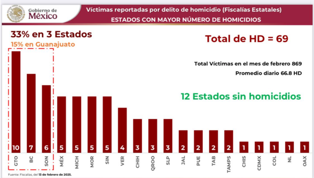 En la más reciente conferencia de prensa del gabinete de seguridad federal en Palacio Nacional, la funcionaria informó que siete estados del país concentraron el 53.1 por ciento de los homicidios dolosos y el primero de ellos es Guanajuato, que registró el 15.2 por ciento del total de enero.