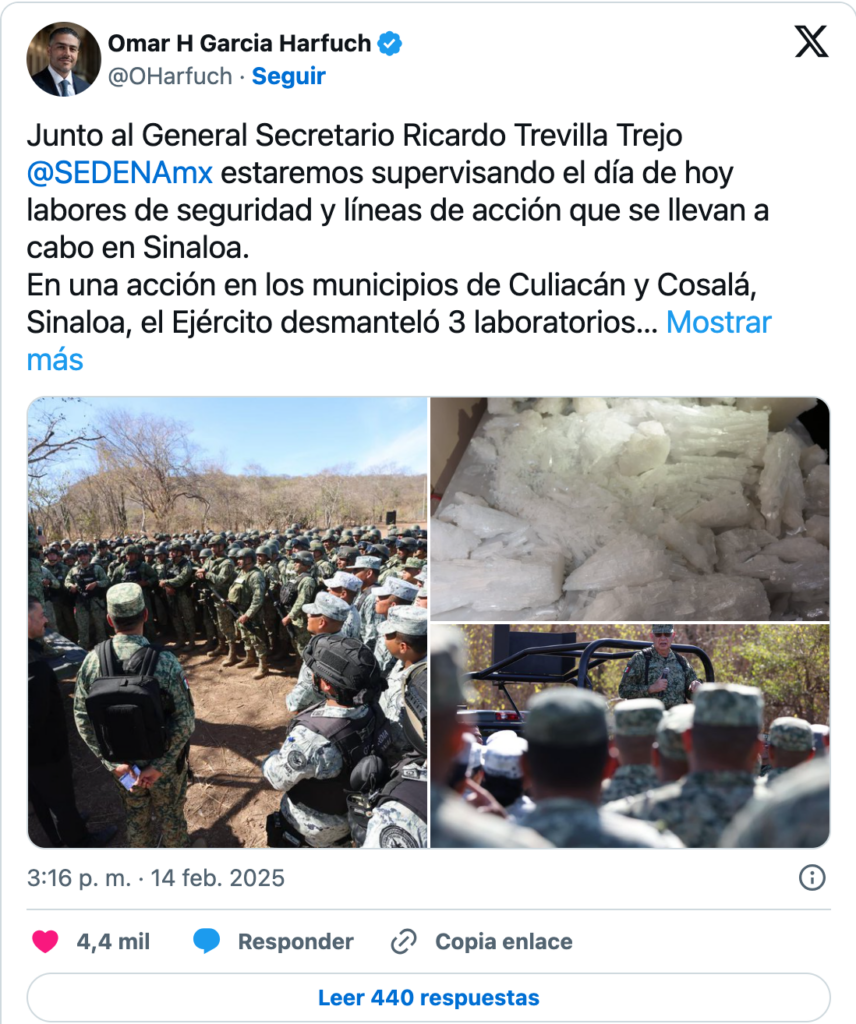 García Harfuch resaltó el desmantelamiento de tres laboratorios clandestinos y nueve áreas de concentración de drogas en los municipios de Culiacán y Cosalá.