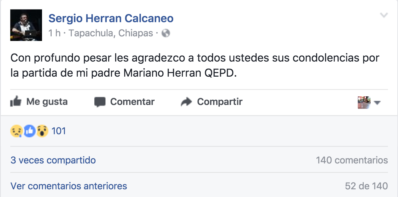 A través de su cuenta de Facebook, Herrán Calcáneo agradeció a familiares y amigos, las muestras de apoyo y solidaridad ante el deceso del también conocido “fiscal de hierro”. “Con profundo pesar les agradezco a todos ustedes sus condolencias por la partida de mi padre Mariano Herrán, QEPD”, escribió en su cuenta.