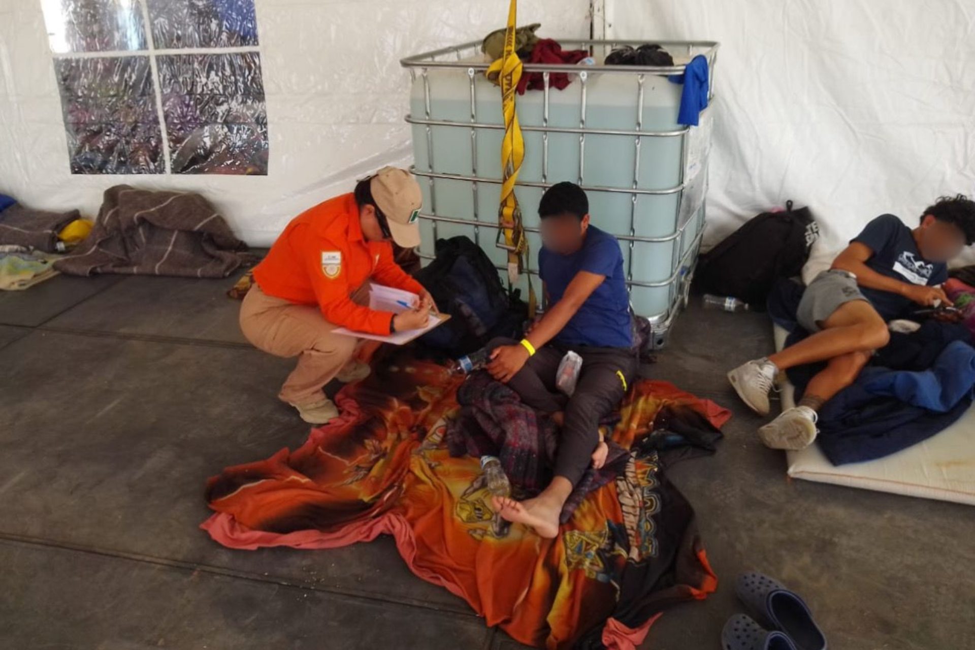 Este refugio temporal está dividido en tres secciones: hombres, mujeres, y núcleos familiares, en los cuales el INM colocó baños, paquetes de higiene personal, colchonetas y mantas térmicas, así como áreas para consumir tres alimentos diarios y agua potable.