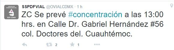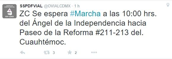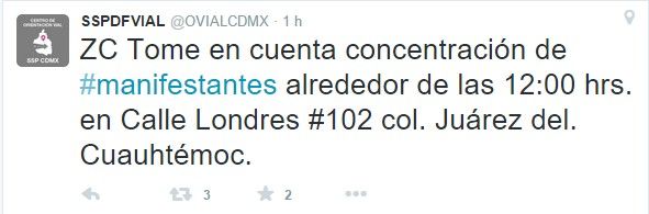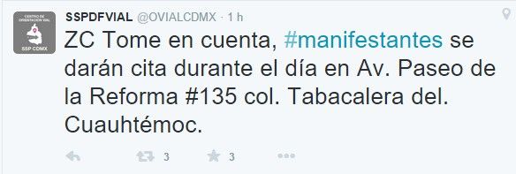 En su cuenta de Twitter @OVIALCDMX, informó que aproximadamente a las 10:00 horas habrá una marcha que partirá de la Columna del Ángel de la Independencia hacia Paseo de la Reforma número 211-213, donde se localiza la sede de la Procuraduría General de la República (PGR).