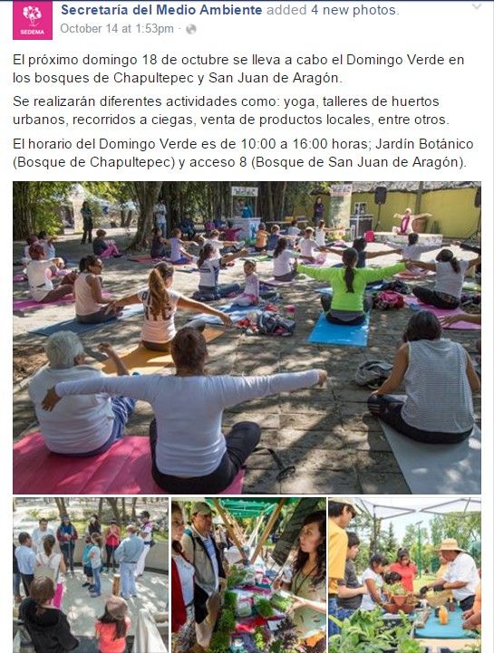 La Secretaría del Medio Ambiente del Distrito Federal exhortó a la población a participar las actividades del “Domingo Verde”, que se llevarán a cabo el 18 de octubre en los bosques de Chapultepec y San Juan de Aragón.