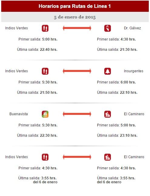 En su página web refirió que la Línea 1, con terminales en Indios Verdes y El Caminero iniciará labores a las 04:30 h y finalizará el servicio a las 03:55 de la madrugada del 6 de enero.