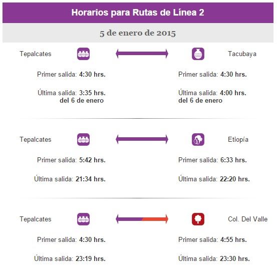 En tanto, la Línea 2 de la terminal Tepalcates comenzará a dar servicio a las 04:30 de la mañana a los destinos Tacubaya y Colonia del Valle, mientras que los transportes con destino a Etiopía saldrán a partir de las 05:42 h y la operación concluirá a las 4:00 h del 6 de enero en la estación Tacubaya.