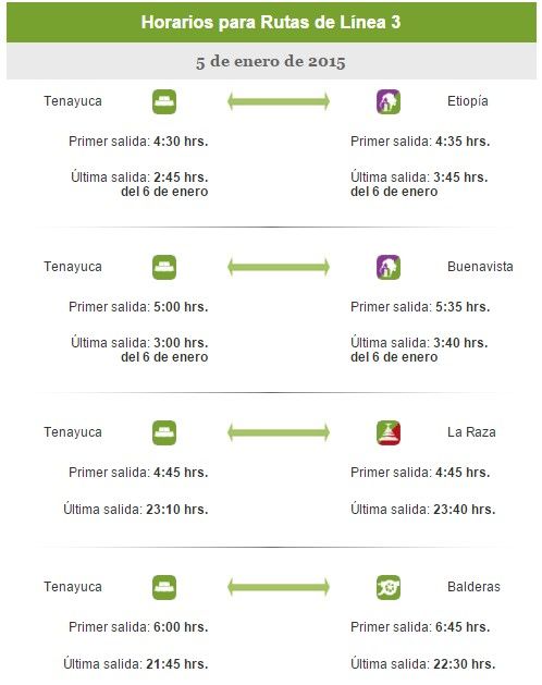 En la Línea 3, la terminal Tenayuca ofrecerá servicio desde las 04:30 h a las estaciones Etiopía, Buenavista, La Raza y Balderas, concluyendo el servicio a las 3:45 h del día siguiente.