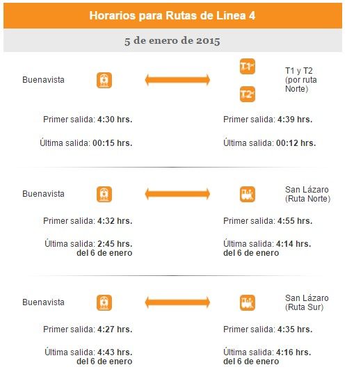 A su vez, la Línea 4 abrirá a las 04:27 h en la terminal Buenavista teniendo como destino San Lázaro en la ruta sur, mientras que en la ruta norte la Terminal 1 y 2 operará a partir de las 04:39 h, concluyendo actividades a las 00:12 h del 6 de enero.