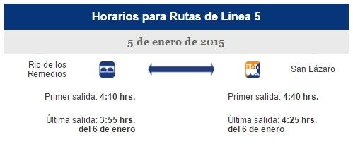 Por último, la Línea 5 con direcciones a Río de los Remedios y San Lázaro tendrán un horario de 04:10 de la mañana hasta las 4:25 h de la madrugada del miércoles.