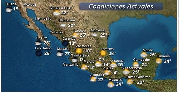 Mientras que en Baja California Sur, Chihuahua, Durango, San Luis Potosí, Sinaloa, Nayarit, Jalisco, Colima, Oaxaca, Chiapas, Veracruz, Tabasco y Quintana Roo predominarán valores de entre 35 y 40 grados.