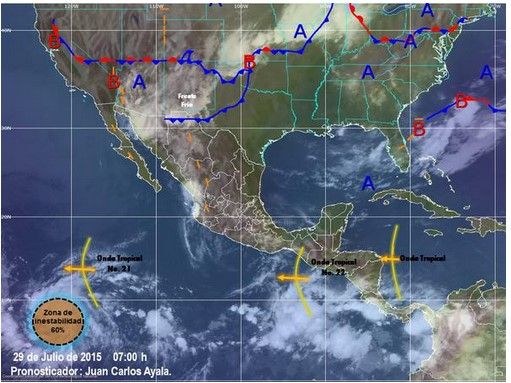 En tanto que la onda tropical 22 avanzará sobre el sureste del país y porciones de la Península de Yucatán, lo que ocasionará lluvias fuertes con chubascos, tormenta eléctrica, caída de granizo y vientos fuertes en Chiapas.