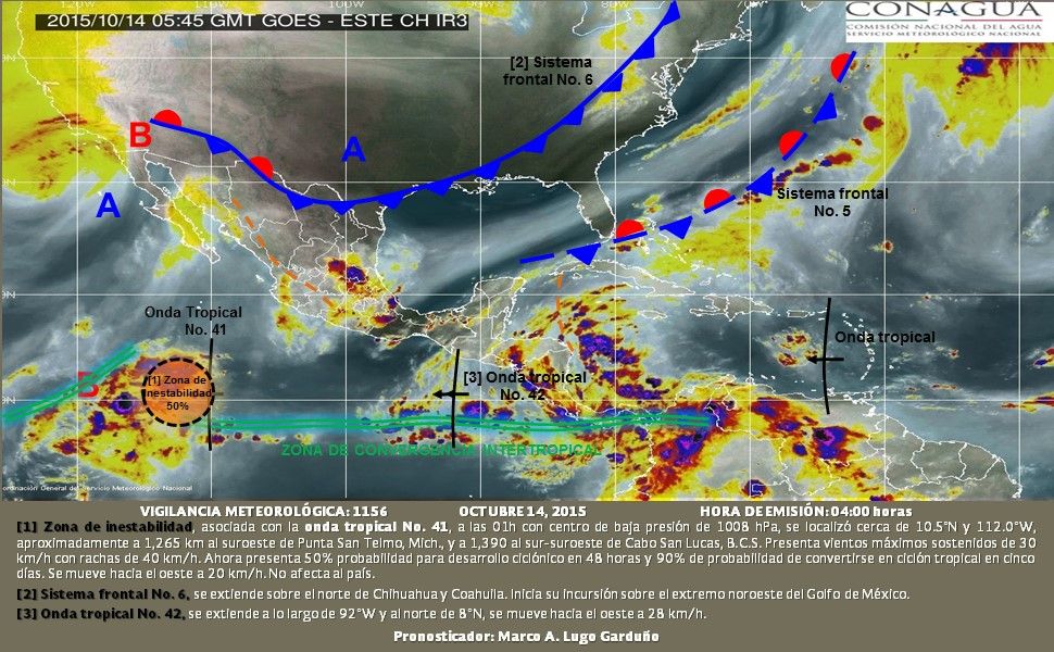 Se espera el desarrollo de nublados con potencial de precipitaciones puntuales fuertes en Jalisco, Michoacán y Guerrero; de menor intensidad en Baja California, Baja California Sur, Sonora, Chihuahua, Aguascalientes, Zacatecas, Durango, Sinaloa, Nayarit, Colima, Guanajuato, Estado de México, Morelos y Distrito Federal.