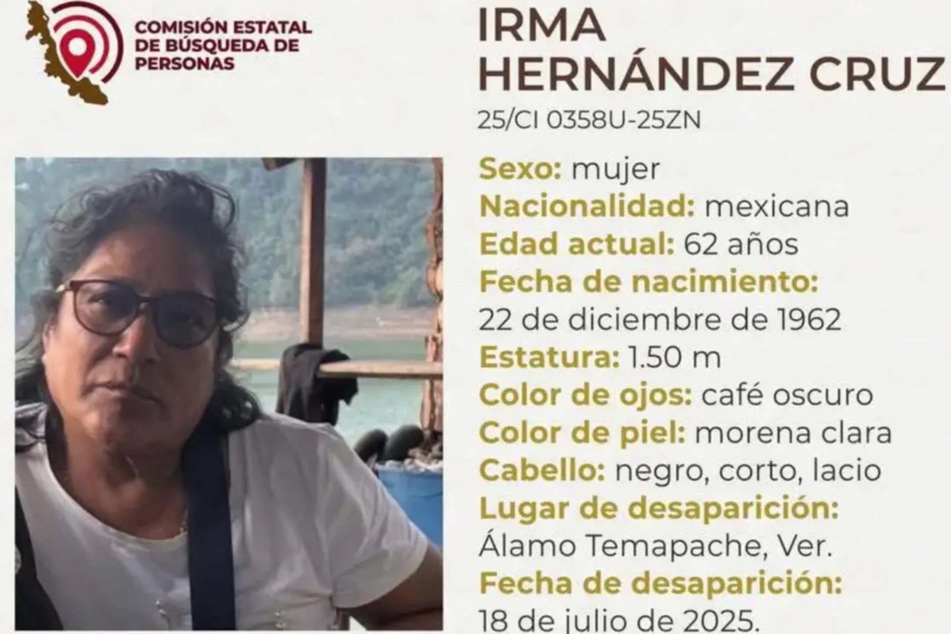 La Fiscalía de Veracruz confirmó la localización del cuerpo de Irma Hernández Cruz, maestra jubilada y taxista, quien había sido secuestrada el 18 de julio, en el municipio de Álamo Temapache, ubicada al norte de la entidad.