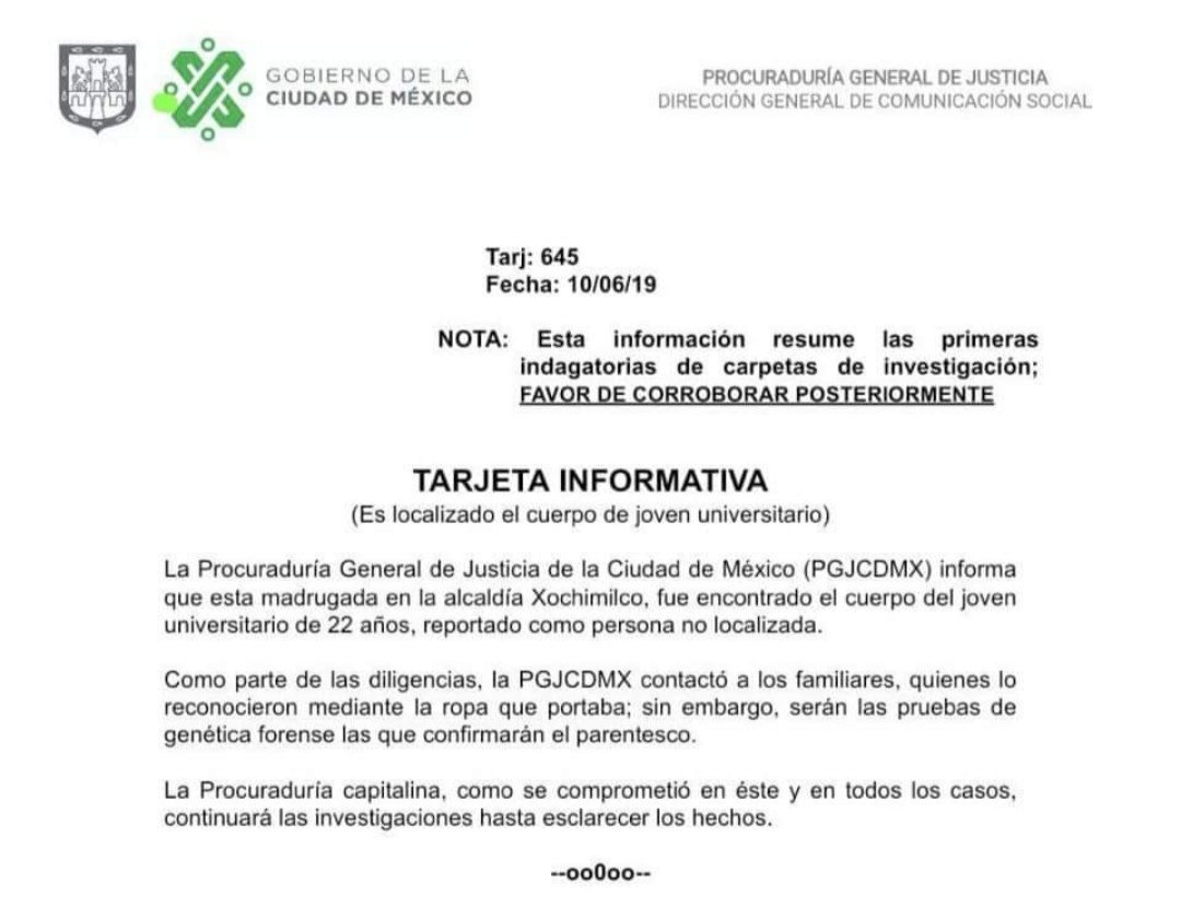 En un segundo mensaje, la PGJ, a cargo de Ernestina Godoy, afirmó que brindará todo el apoyo a familiares del joven estudiante y se llevan a cabo las indagatorias correspondientes para ubicar a los responsables.