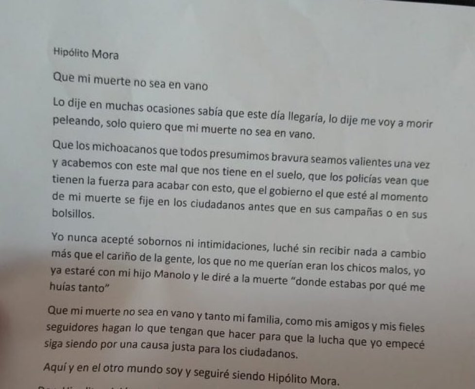 El fundador de los grupos de autodefensa en Michoacán, Hipólito Mora, escribió una carta para cuando lo mataran, cuyo contenido se hizo público tras su asesinato en su pueblo natal La Ruana.