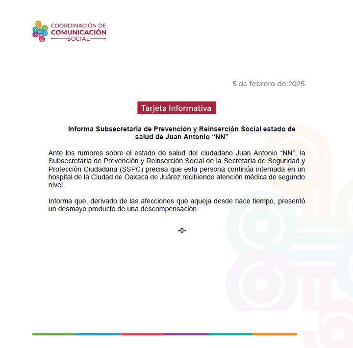 Mediante un comunicado, la Subsecretaría de Prevención y Reinserción Social precisó que Vera Carrizal se desmayó a consecuencia de una descompensación por las afecciones que lo aquejan.