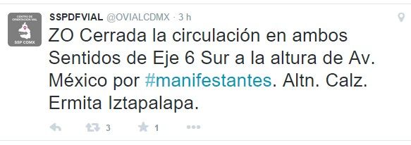 La dependencia capitalina indicó que esta mañana habrá una protesta en Avenida México y Eje 6 Sur Av. Las Torres, colonia Santa María Aztahuacán, delegación Iztapalapa.