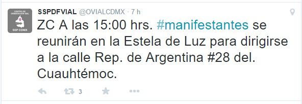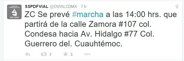 En su cuenta de Twitter @OVIALCDMX, dio a conocer que a las 14:00 h habrá una protesta que partirá de la calle Zamora, número 107, en la colonia Condesa con dirección hacia Avenida Hidalgo, número 77, colonia Guerrero, delegación Cuauhtémoc.