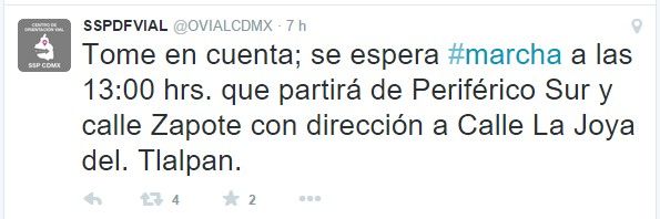 La dependencia capitalina detalló que a las 13:00 h se espera una marcha que partirá de Periférico Sur y calle Zapote con dirección a la calle La Joya, en la delegación Tlalpan.