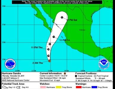 En las próximas 24 horas, se prevé que Sandra continuará su desplazamiento hacia el norte, mientras disminuye su intensidad.