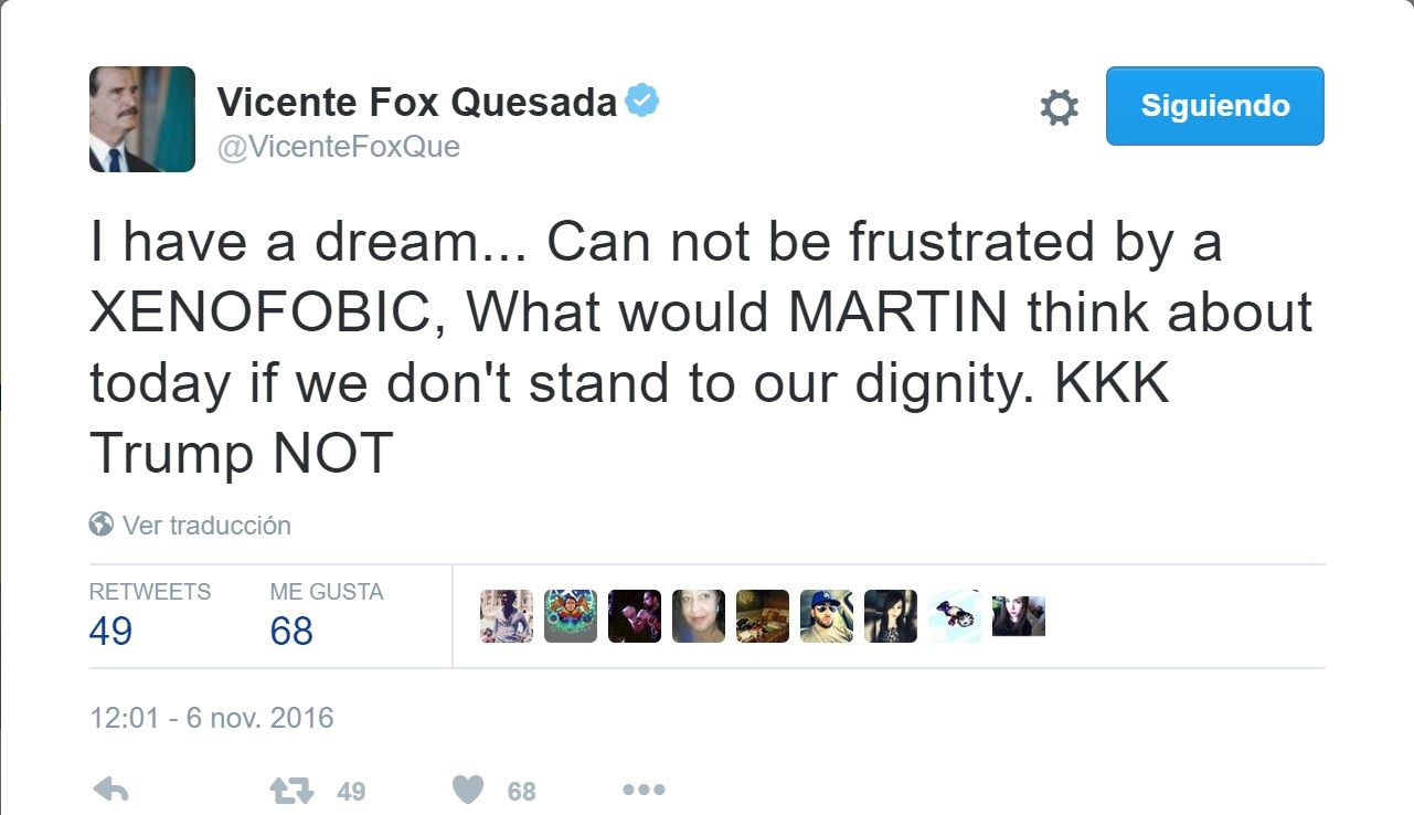 “Tengo un sueño… que no puede ser frustrado por un xenófobo. ¿Qué pensaría Martin si no mantenemos nuestra dignidad?”, señaló Vicente Fox, finalizando su publicación usando las siglas KKK para hacer referencia al grupo Ku Klux Klan. “KKK Trump No”, señaló la parte final del mensaje.