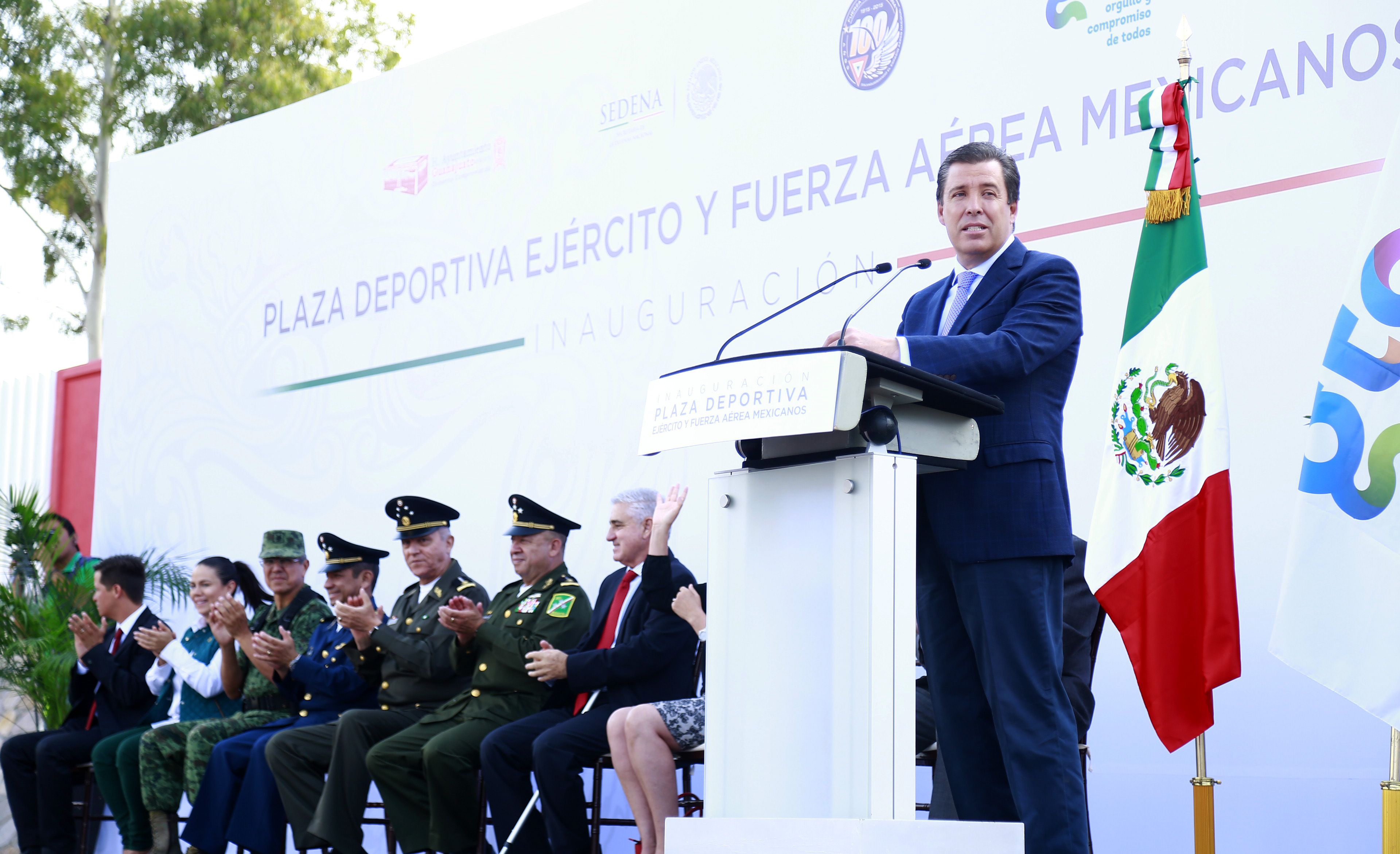 Por esa razón, señaló, la plaza deportiva “Ejército y Fuerza Aérea Mexicanos” es un claro ejemplo de trabajo en equipo y empatía que tienen los guanajuatenses con sus fuerzas armadas. Enfatizó, además que sociedad, gobierno y fuerzas armadas deben seguir convergiendo en esfuerzos conjuntos para garantizar la tranquilidad de los connacionales.