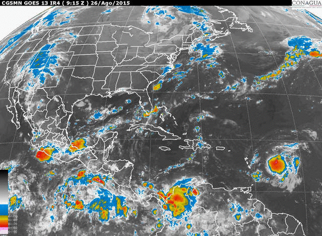 En tanto, la tormenta tropical Erika se ubica a tres mil 210 kilómetros al este de las costas de Quintana Roo y se mueve hacia el oeste a una velocidad de 28 kilómetros por hora con vientos de 75 kilómetros por hora y rachas de 95 kilómetros por hora.