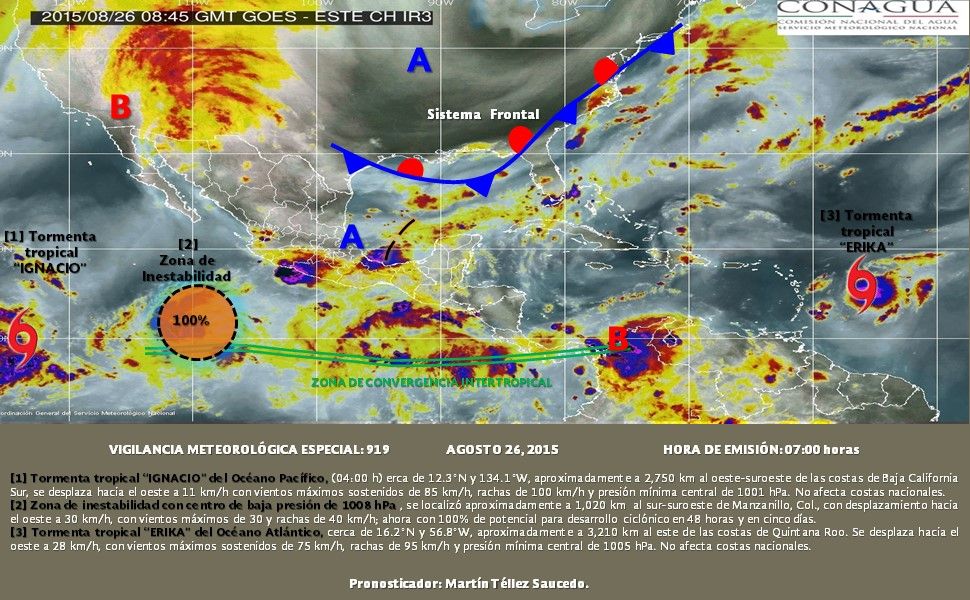 A su vez, la tormenta tropical Ignacio se localiza aproximadamente a dos mil 750 kilómetros al oeste-suroeste de Baja California Sur; se desplaza hacia el oeste a 11 kilómetros por hora con vientos máximos sostenidos de 85 kilómetros por hora y rachas de 100 kilómetros por hora.