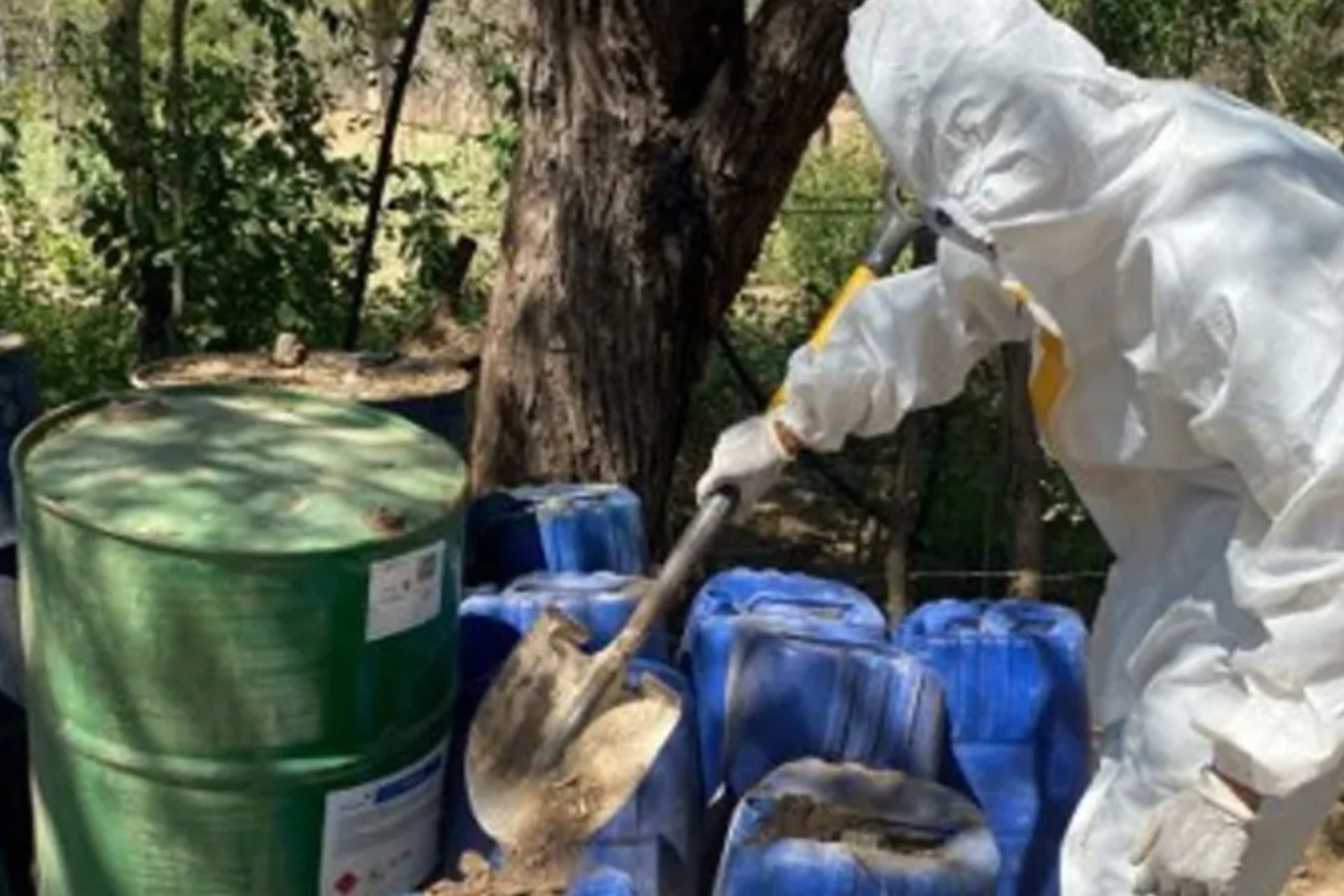 Elementos del Ejército Mexicano inhabilitaron en Culiacán, Sinaloa, un total de cuatro áreas de concentración de material diverso para la elaboración de metanfetamina, en donde fueron asegurados un total de mil 470 litros de sustancias químicas.