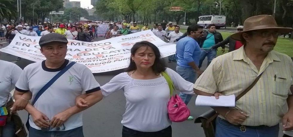 Maestros del Sindicato de Maestros al Servicio del Estado de México, y que dicen simpatizar con la CNTE, marchan sobre Paseo de la Reforma rumbo a la Residencia Oficial de Los Pinos en demanda de una evaluación docente formativa y no punitiva.