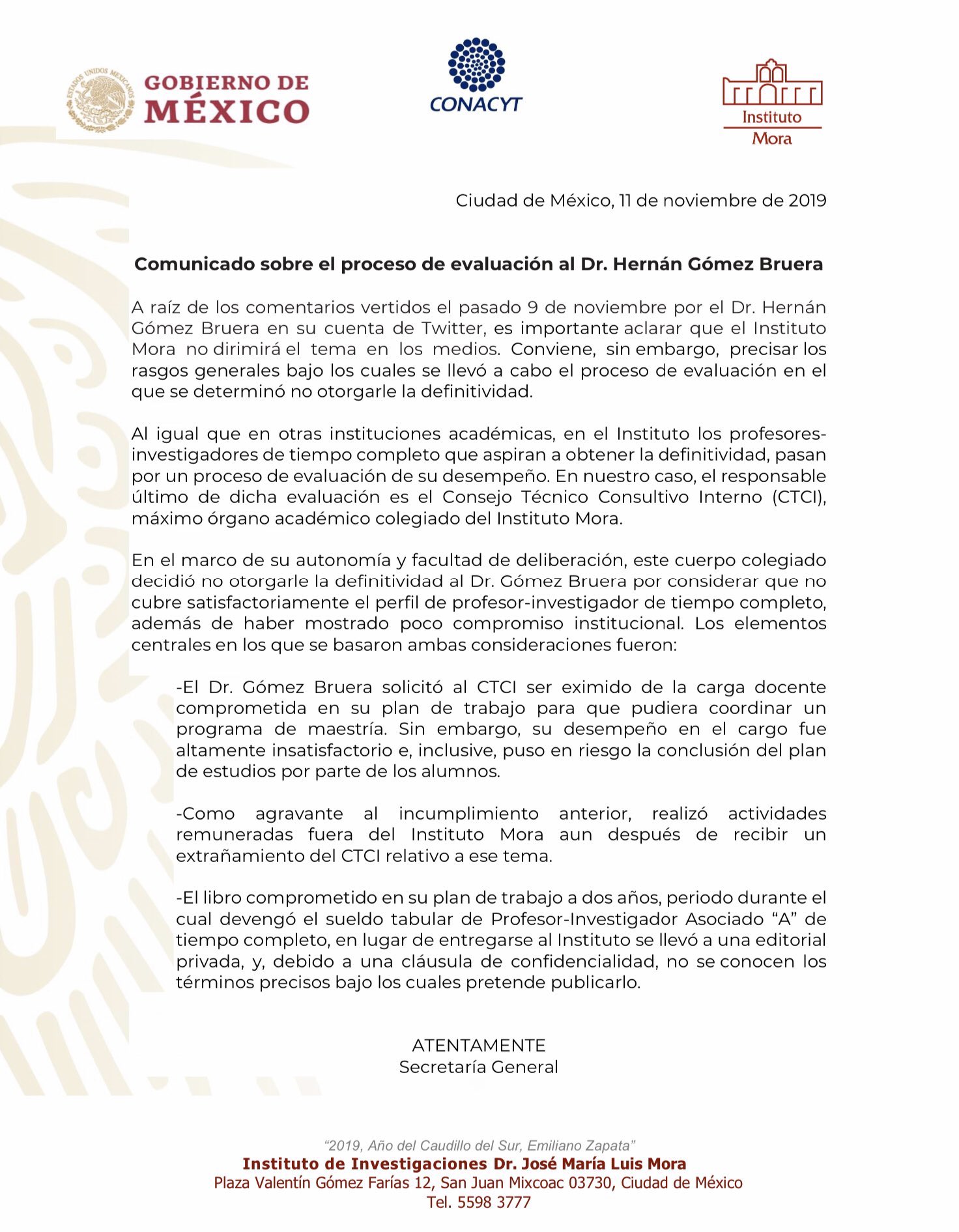 El Instituto Mora respondió a los comentarios emitidos por el doctor Hernán Gómez Bruera en su cuenta de Twitter, explicando las razones por las cuales se determinó no otorgarle la definitividad.