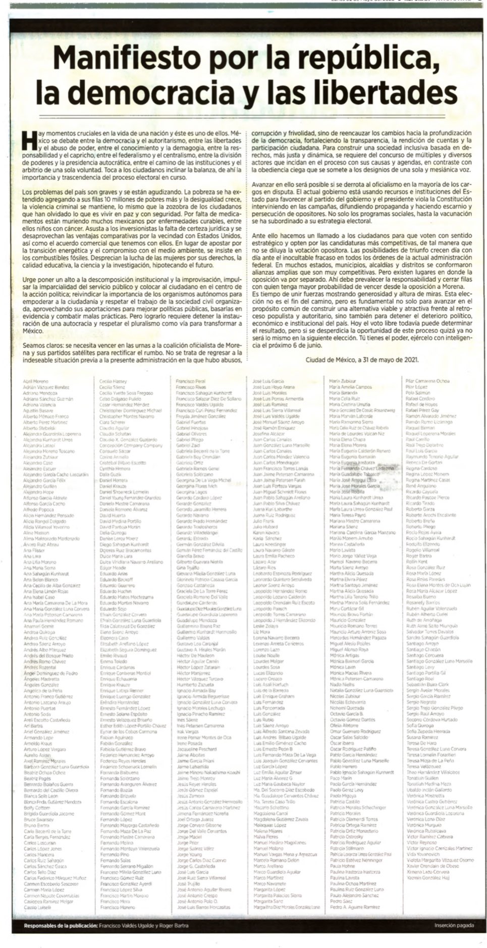 El manifiesto está suscrito, entre otros, por el politólogo Francisco Valdés Ugalde; el antropólogo Roger Bartra; el historiador Enrique Krauze; el escritor Héctor Aguilar Camón y el empresario Claudio X. González.