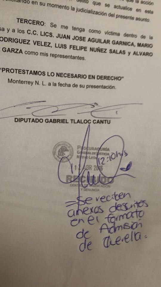 El diputado local de Nuevo León del Partido Revolucionario Institucional, Gabriel Tláloc Cantú, presentó una denuncia penal este día en contra del subprocurador anticorrupción, Ernesto Canales Santos, por amenazas y abuso de autoridad.