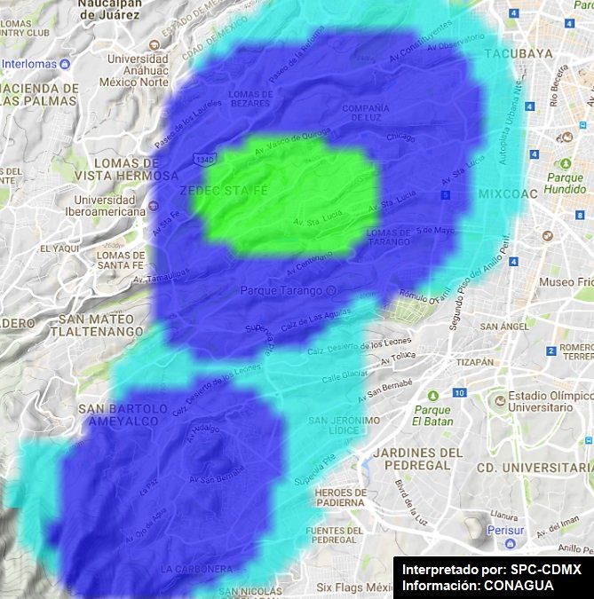 En tanto, se registra lluvia ligera en las delegaciones Azcapotzalco, Cuauhtémoc, Gustavo A. Madero, Magdalena Contreras y Tlalpan.