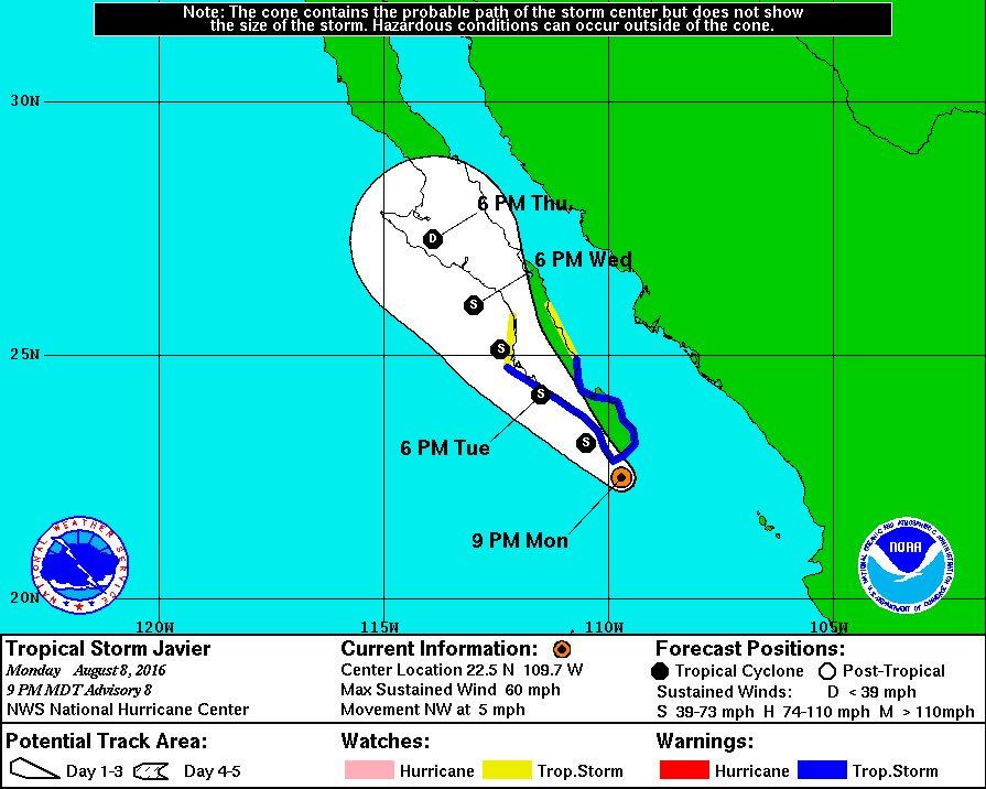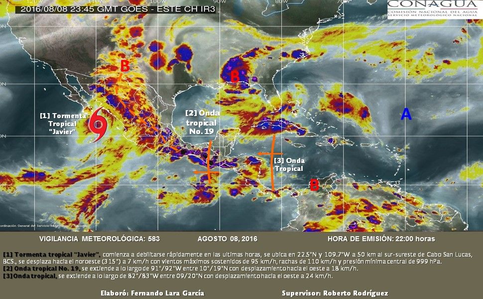 La tormenta tropical Javier tocará tierra por Cabo San Lucas. Generará lluvias muy fuertes con tormentas intensas el día de mañana