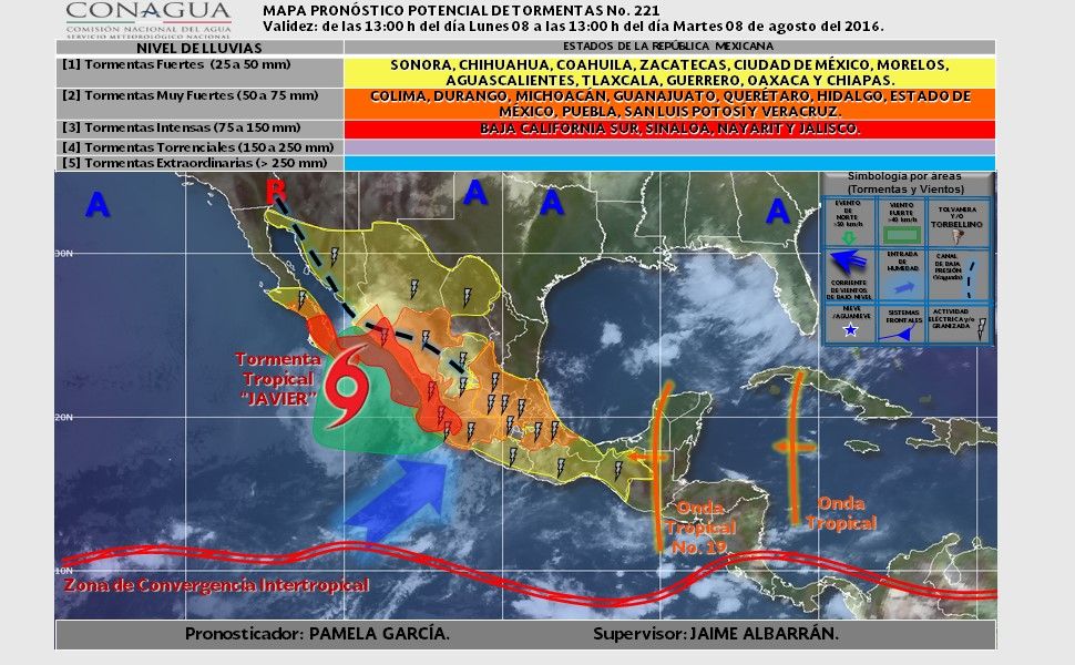 La Conagua advirtió que Javier se localizará muy cerca de la costa occidental de Baja California Sur y propiciará lluvias muy fuertes de 50 a 75 mm con tormentas locales intensas de 75 a 150 mm en Baja California Sur; chubascos fuertes de 25 a 50 mm con tormentas muy fuertes de 50 a 75 mm en regiones de Sonora, Chihuahua, Durango y Sinaloa; chubascos de 5.1 a 25 mm con tormentas fuertes de 25 a 50 mm en áreas de Nayarit, Jalisco y Colima, así como chubascos de 5.1 a 25 mm en Baja California.