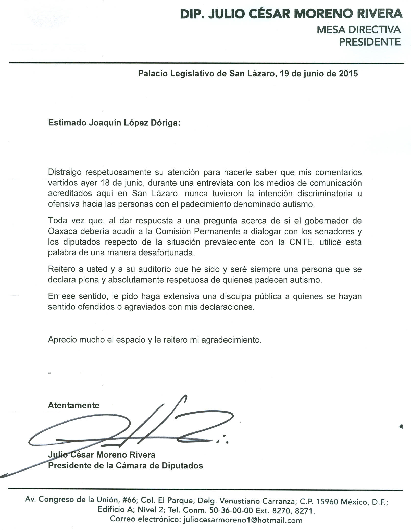 En una carta enviada este viernes, el diputado me aseguró que sus comentarios “nunca tuvieron la intención discriminatoria u ofensiva hacia las personas con el padecimiento denominado autismo”.