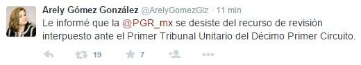 La procuradora tuiteó: “Le informe que la PGR se desiste del recurso de revisión interpuesto ante el Primer Tribunal Unitario del Décimo Primer Circuito”.