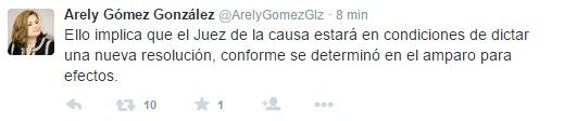En un segundo tuit, detalla que “Ello implica que el Juez de la causa estará en condiciones de dictar una nueva resolución, conforme se determinó en el amparo para efectos.”