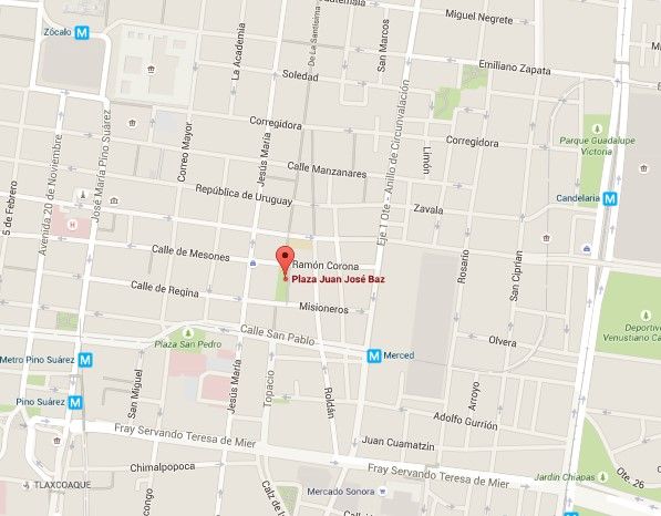 La plaza se localiza entre las calles de Misioneros y Mesones, en su intersección con la calle peatonal Talavera. A dos cuadras del Mercado de la Merced.