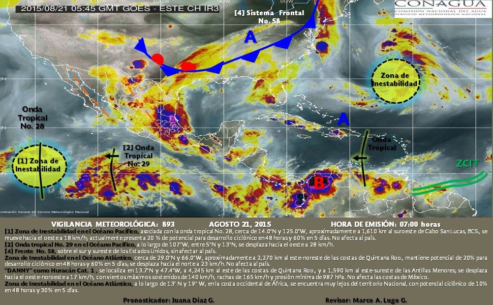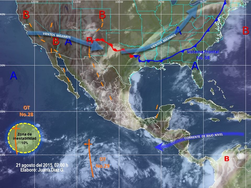La dependencia de la Comisión Nacional del Agua (CONAGUA) explicó que el origen de estas precipitaciones son dos canales de baja presión, los cuales continúan, uno en noroeste, occidente y centro del país, y el segundo en el sureste y la Península de Yucatán, que además se asociarán con la entrada de humedad de Océano Pacífico, Golfo de México y mar Caribe.