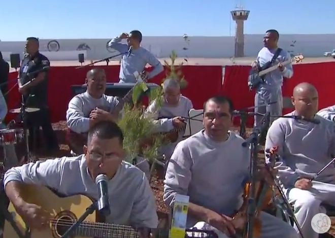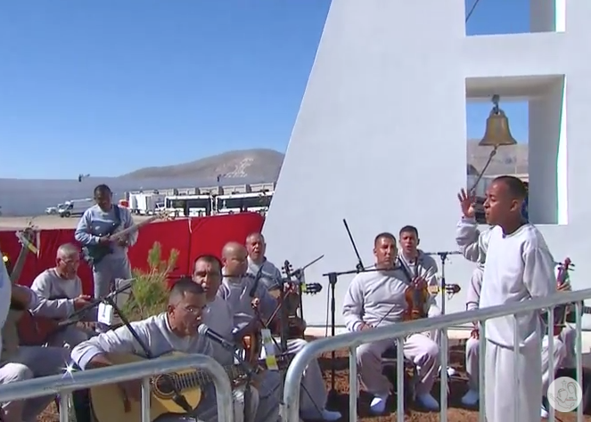 Tras ingresar a las instalaciones del penal, el papa fue recibido por un grupo de internos, que interpretaron una canción compuesta en su honor.