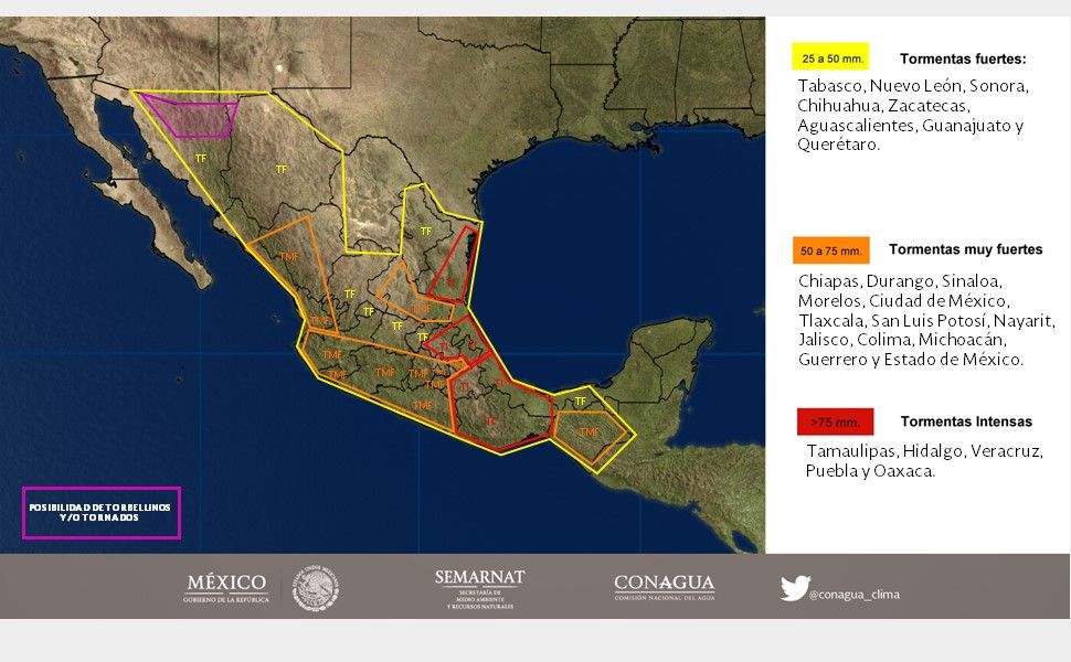 En la Mesa del Norte habrá cielo medio nublado con tormentas puntuales muy fuertes en Durango, fuertes en Zacatecas, Aguascalientes y San Luis Potosí, chubascos en Chihuahua y Nuevo León, y lluvias dispersas en Coahuila. Ambiente caluroso y viento de componente este de 20 a 35 km/h con rachas superiores a 50 km/h en Zacatecas, Aguascalientes y San Luis Potosí, y superiores a 60 km/h con posibles tolvaneras y torbellinos en Coahuila y Nuevo León.