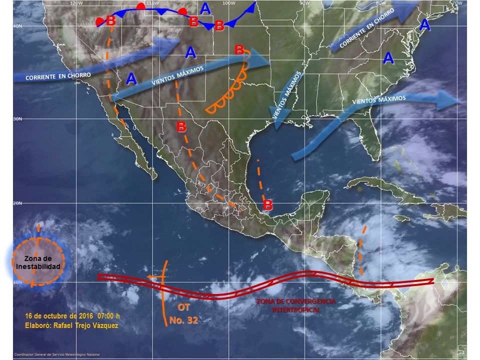 En el Pacífico Sur se estima cielo medio nublado a nublado, 60 por ciento de probabilidad de tormentas puntuales muy fuertes en Chiapas y tormentas puntuales fuertes en Guerrero.