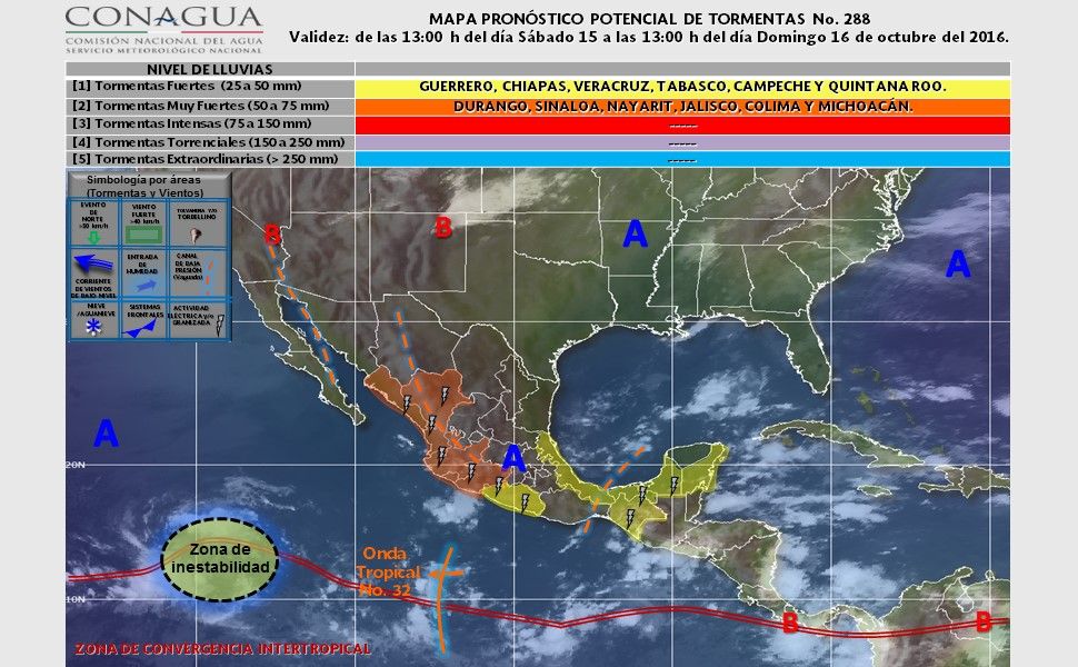 El SMN detalló que los fenómenos meteorológicos generarán durante mañana de este domingo tormentas muy fuertes en sitios de Chiapas, tormentas fuertes en zonas de Durango, Sinaloa, Nayarit, Jalisco, Colima, Michoacán, Guerrero, Veracruz, Puebla, Estado de México, Ciudad de México, Morelos, Tabasco y Quintana Roo, así como lluvias con intervalos de chubascos en regiones de Chihuahua, Hidalgo, Tlaxcala, Campeche y Yucatán, y lluvias escasas en Coahuila, Nuevo León, Tamaulipas, San Luis Potosí, Guanajuato, y Querétaro.