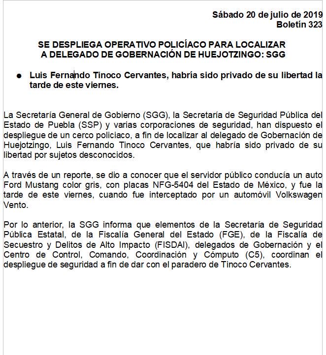La Secretaría General de Gobierno de Puebla informó el sábado que el funcionario fue posiblemente secuestrado por sujetos desconocidos a bordo de un Volkswagen Vento.