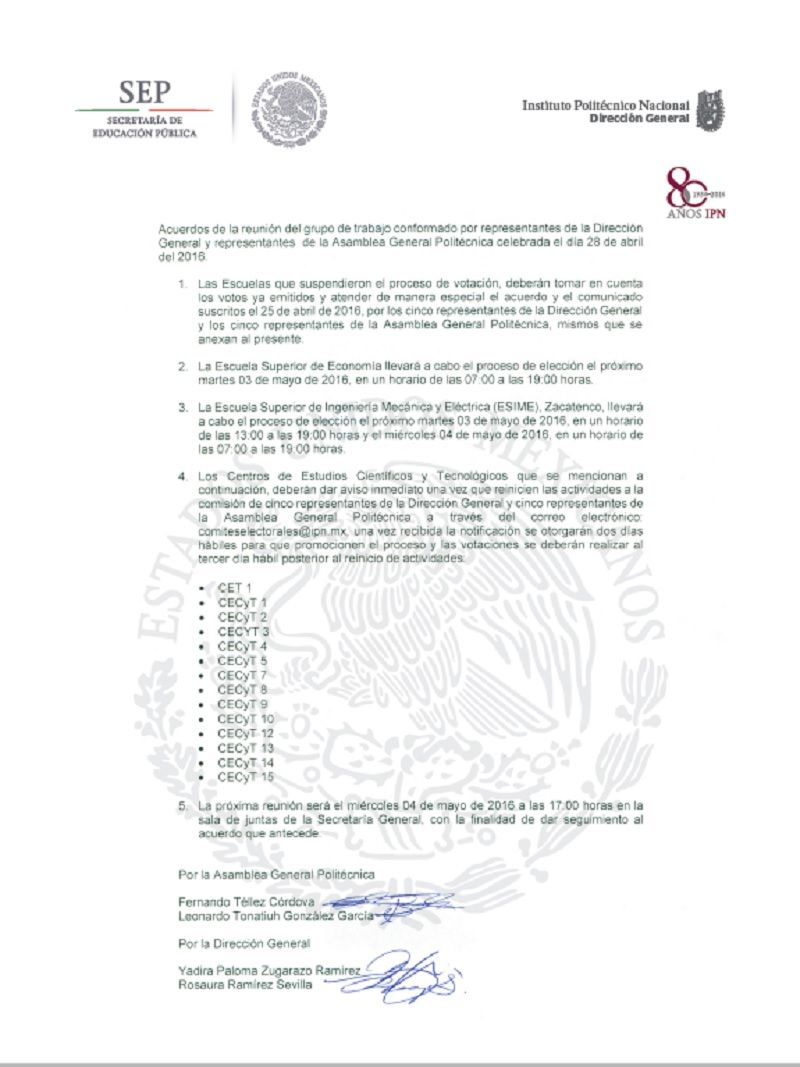 El director del Instituto Politécnico Nacional (IPN), Enrique Fernández Fassnacht, representantes de los Centros de Estudios Científicos y Tecnológicos (CECyT) y de la Asamblea General Politécnica (AGP) dieron a conocer el jueves una minuta en la que se acordó levantar los paros y refrendar el diálogo para la atención a las demandas de los alumnos con las autoridades.