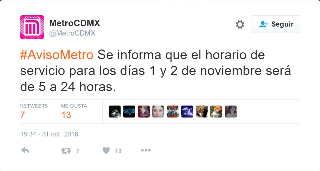Así lo informó el STC Metro a través de su cuenta de Twitter, señalando que los días de mañana y pasado mañana (1 y 2 de noviembre), los usuarios podrán viajar en un horario de 5:00 a 24:00 h.