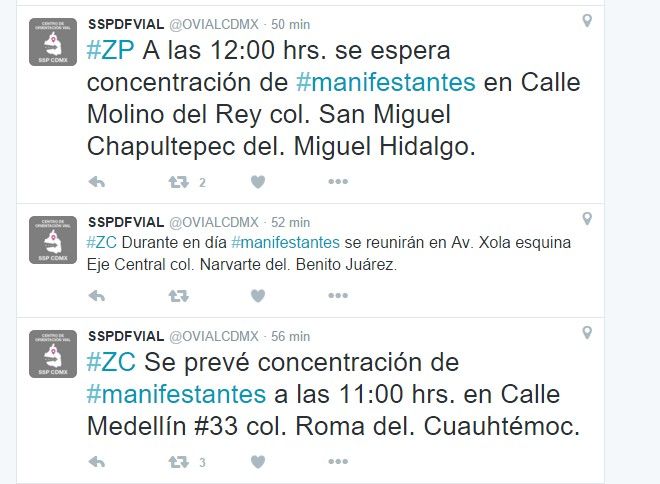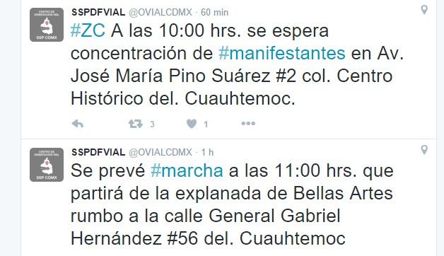 En su cuenta de Twitter @OVIALCDMX, indicó que a las 10:00 horas se espera concentración de inconformes cerca del edificio sede de la Suprema Corte de Justicia de la Nación, en avenida José María Pino Suárez, número 2, colonia Centro Histórico, delegación Cuauhtémoc.