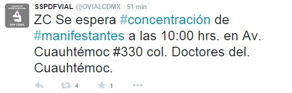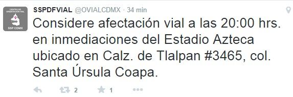 La Secretaría de Seguridad Pública del Distrito Federal (SSPDF) informó mediante su cuenta de Twitter que el día de hoy se esperan dos manifestaciones en la delegación Cuauhtémoc, y que el duelo entre el Club América y Dorados también podría causar afectaciones viales en la zona.