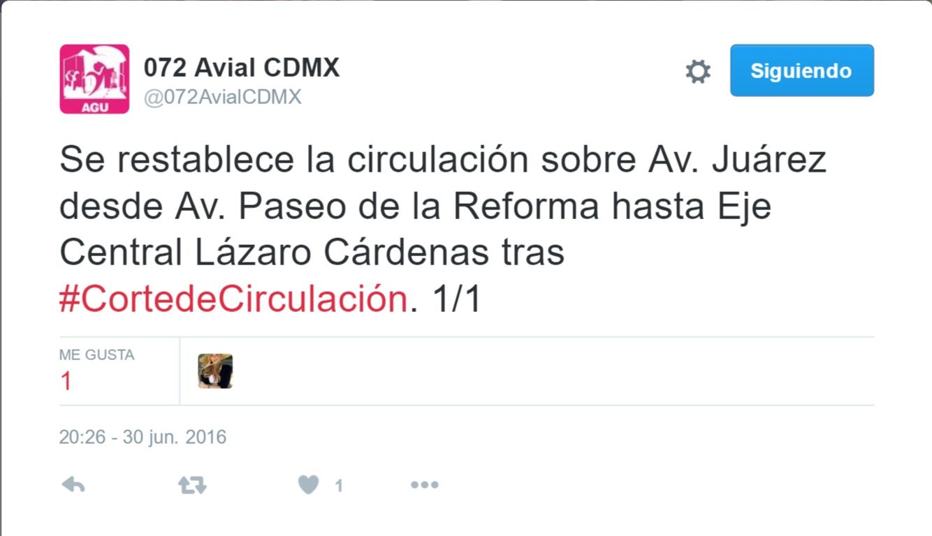 Aproximadamente a las 20:10 h, se reportó que las movilizaciones en Paseo de la Reforma y Avenida Juárez terminaron, y con ello dio inicio la liberación de las vialidades del centro de la Ciudad de México.