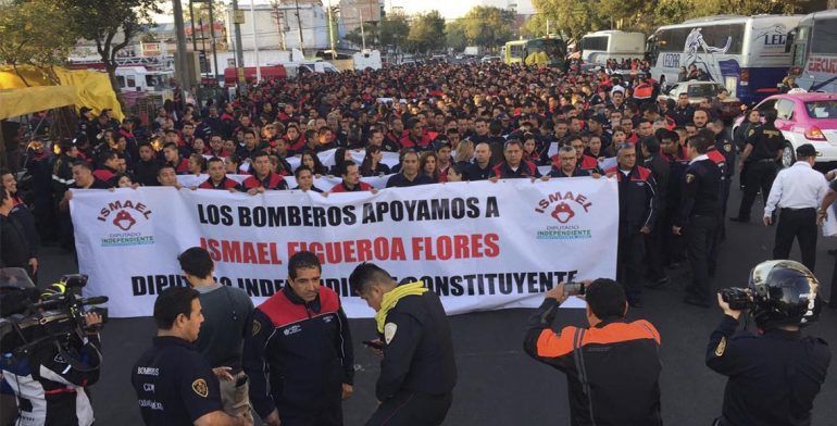 Bomberos y rescatistas de la capital mexicana alistan marcha en apoyo a Ismael Figueroa, asambleísta e integrante del Constituyente, en la base principal de los vulcanos.